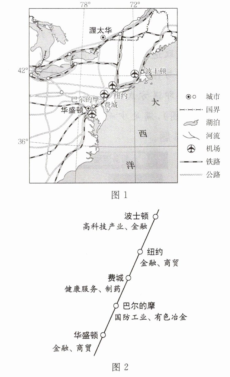 材料二 图1为北美部分地区略图。图2为波士华城市带主要城市的支柱产业。
