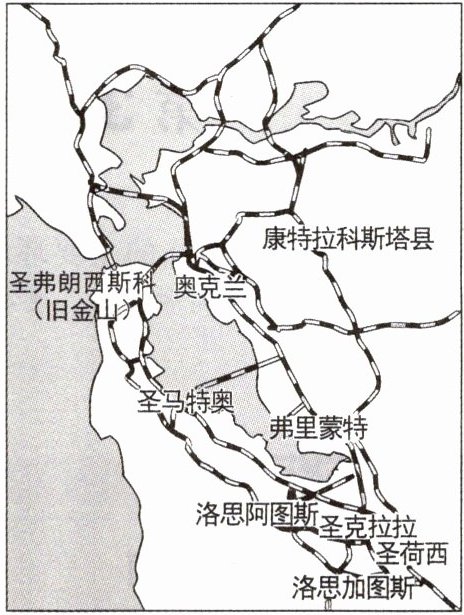 下图示意旧金山湾区分布及陆上主要交通干线分布。