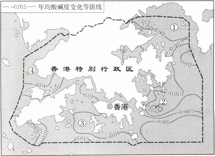(2023·安徽模拟)海洋表层水体的pH值约为8.2,呈弱碱性。长期以来这种稳定的化学环境维持着海洋生态系统的平衡。海洋酸化(pH值降低)是全球气候变化下海洋系统面临的又一重要生态环境问题。下图为香港周边不同海域1986—2017年的年均酸碱度变化等值线图。读图,完成1~3题。
