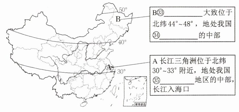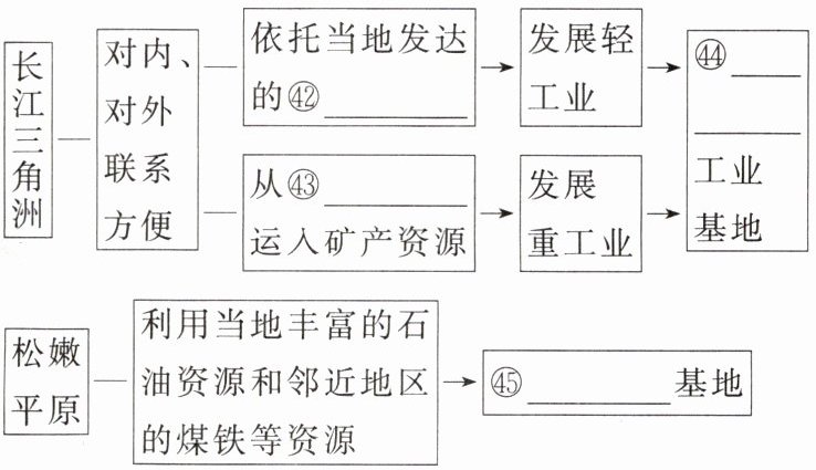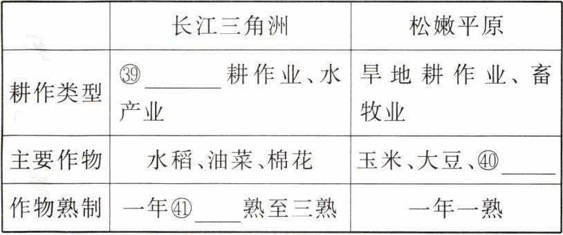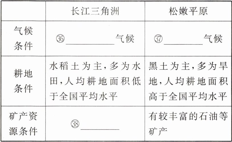 ㉚人类活动 ㉛发展变化 ㉜活动方式 ㉝松嫩平原 ㉞东北地区 ㉟东部沿海 ㊱亚热带季风 ㊲温带季风 ㊳贫乏 ㊴水田 ㊵春小麦 ㊶两 ㊷农业基础 ㊸国内外 ㊹综合性 ㊺重化工业 ㊻水稻 ㊼净输出区 ㊽净输入区