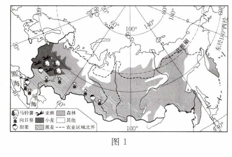 材料一 俄罗斯耕地面积位列世界第三,是世界小麦主要出口国之一,但其农业发展水平仍低于中国。图1为俄罗斯主要农作物及森林分布示意图。