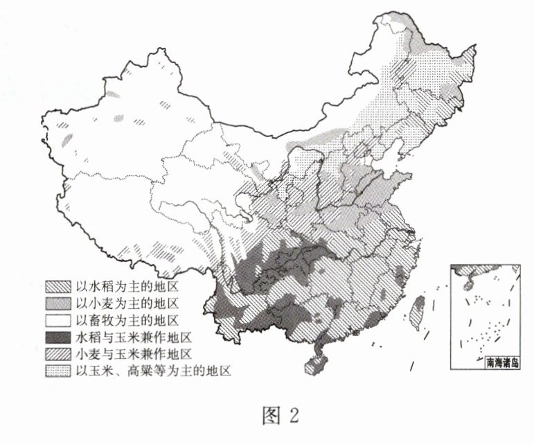 材料二 中俄两国的农业资源禀赋、各具特色,双方在农产品贸易、农业科研和农业生产资源(劳动力、生产资料)等领域加强合作可以实现优势互补。图2为中国主要粮食作物分布示意图。
