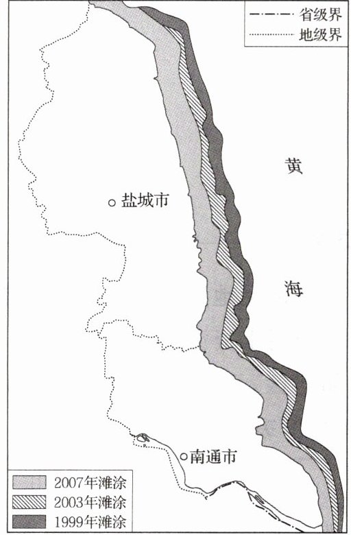 (2023·福建厦门模拟)沿海滩涂指沿海大潮高潮位与低潮位之间的潮浸地带,属于土地,又是海域的组成部分。滩涂是中国重要的后备土地资源,具有面积大、分布集中、区位条件好、农牧渔业综合开发潜力大等特点。下图示意江苏沿海局部海岸滩涂面积的变化情况。读图,完成1~3题。
