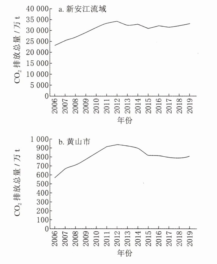(2023·辽宁模拟)新安江是安徽省三大水系之一,横跨安徽省和浙江省,是中国首个跨省流域生态补偿机制的试点区域,于2012年正式启动。以两省交界处水域为考核标准,上游安徽提供水质优于基本标准的,由下游浙江对安徽给予补偿,劣于基本标准的,由安徽对浙江给予补偿。研究表明,水污染的综合治理也会对当地起到放氧固碳、净化大气的作用。下图示意2006—2019年新安江流域及其上游黄山市二氧化碳排放总量变化。据此完成3~5题。