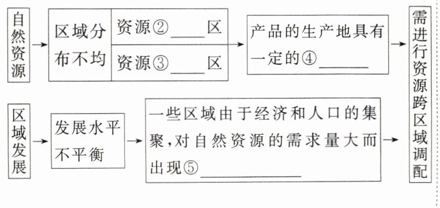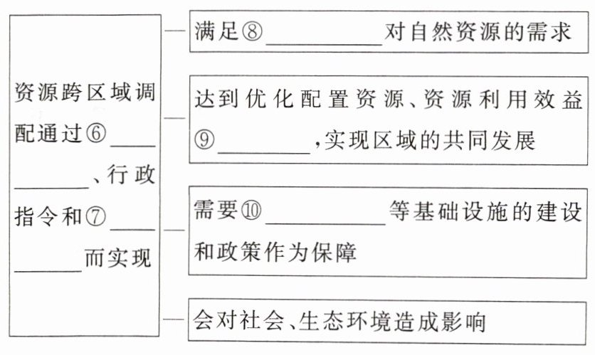 1.调配原因:国家为了解决国内资源及其产品①生产和消费的空间不匹配问题。3.调配影响。一满足⑧区域发展对自然资源的需求资源跨区域调 达到优化配置资源、资源利用效益配通过⑥市场机制,实现区域的共同发展、行政指令和⑦统筹规划需要⑩交通运输等基础设施的建设而实现 和政策作为保障。