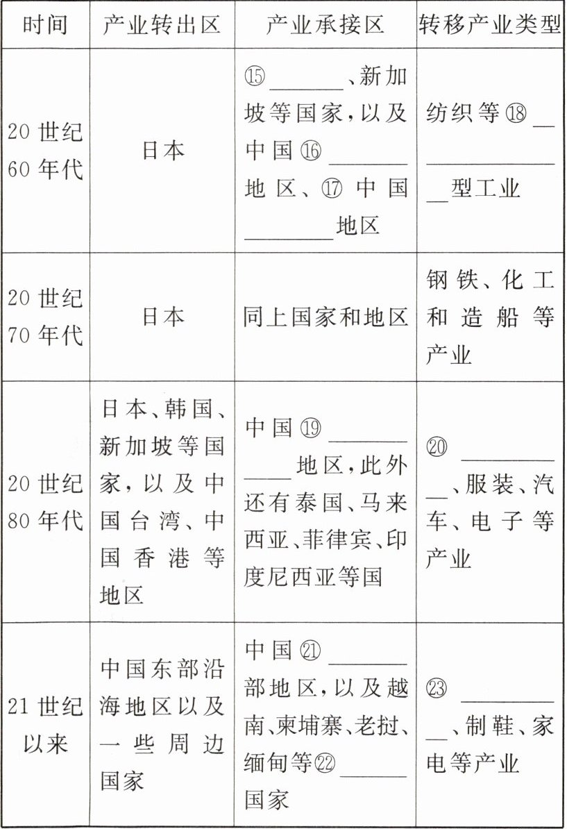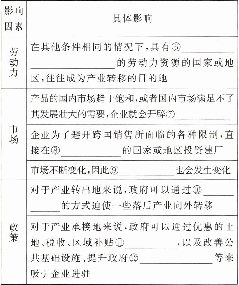 ①国际产业转移 ②国内产业转移 ③发达 ④欠发达 ⑤生产成本 ⑬国际经济形势 ⑭运输成本