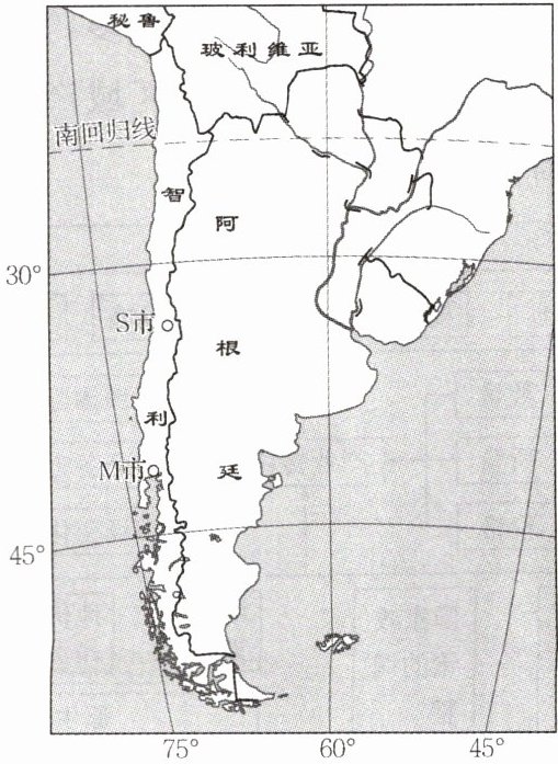 智利是首个与我国签署自由贸易协定的南美洲国家,并于2019年与我国签署共建“一带一路”谅解备忘录。近年来,中智两国经贸合作日益紧密,我国向智利出口机电、轻工等产品,从智利主要进口矿产、农林产品①,两国合作前景广阔。下图为南美洲部分地区图。