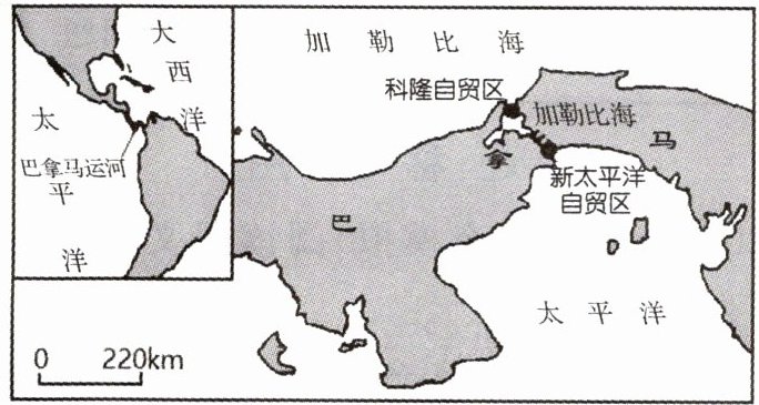 (2023·吉林辽源模拟)自由贸易园区是某一国或地区在境内划出的一个特定区域,自主给予特殊优惠税收和监管政策。为了改变经济落后状况,巴拿马于1948年建立科隆自贸区(下图)发展转口贸易(从各国进口商品再批发到拉美地区)。20世纪70年代,拉美地区陆续建立新的自贸区。20世纪80年代以来,科隆自贸区转型发展了以运河航运为基础的金融、保险、通讯等产业。据此完成3~5题。