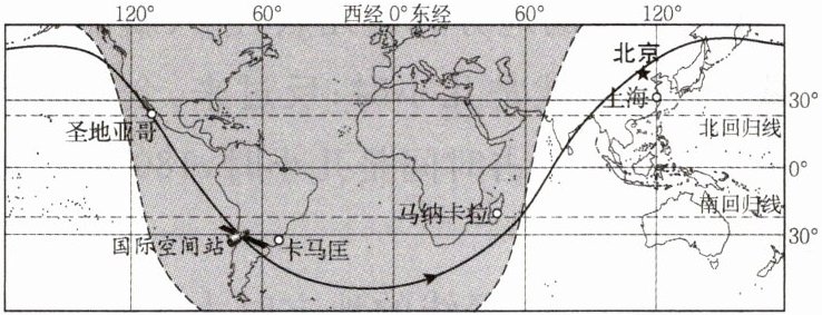 (3)空间站从图示位置飞行1小时,在这期间能看到空间站的地点是 (