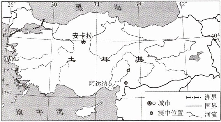 (2024·江苏扬州模拟)2023年2月6日,土耳其发生两次7.8级地震,震源较浅。中国救援队于北京时间2月7日23时从北京起飞,当地时间2月8日4时30分抵达土耳其阿达纳机场。下图示意该次地震震中位置。读图,完成1~3题。