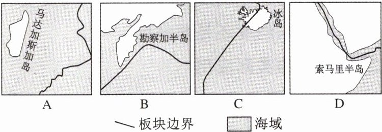 3.B 解析 地震是地球板块挤压碰撞的结果,土耳其位于亚欧板块、印度洋板块、非洲板块的板块消亡边界。图A为非洲板块和印度洋、南极洲板块的生长边界,A项错误。图B为亚洲板块和太平洋板块的消亡边界,B项正确。图C位于亚欧板块和美洲板块的生长边界,C项错误。图D位于非洲板块和印度洋板块的生长边界,D项错误。故选B。