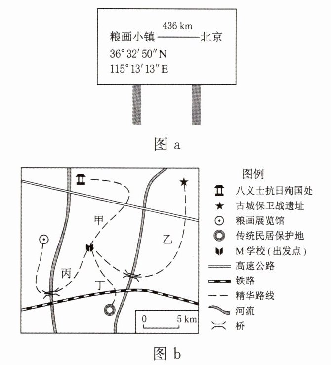 【例2】(2021·北京卷)我国某镇利用当地主产的粮食制作粮画,打造粮画小镇。图a是M学校设计的小镇地理位置指示牌,图b是该校设计的四条“行走的思政课”精华路线示意图。读图,完成(1)~(2)题。