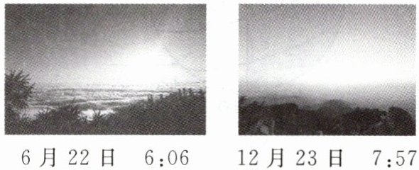 (2022·天津卷)一位摄影爱好者在我国某山拍摄日出照片,下图是他在不同时间拍摄的两幅照片。回答3~4题。