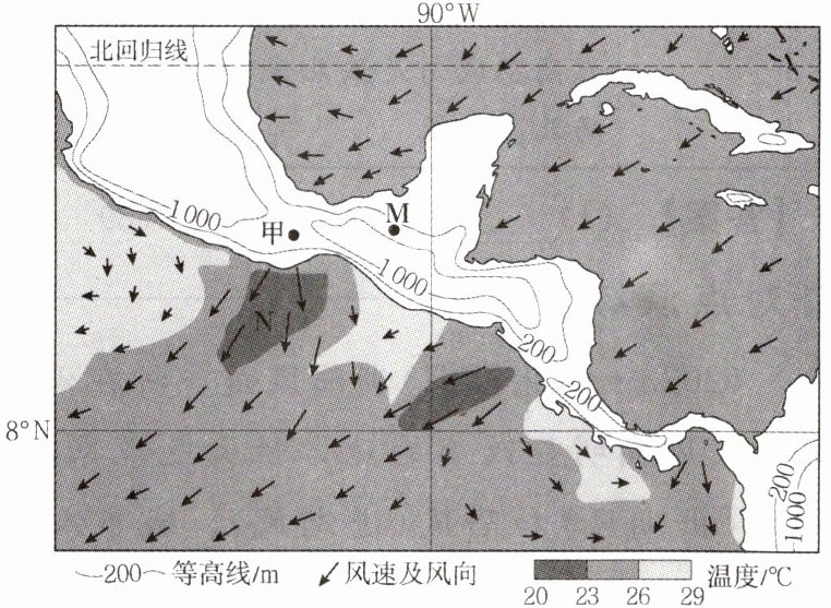 ,美洲中部附近海洋表层风场和海平面气温分布。甲