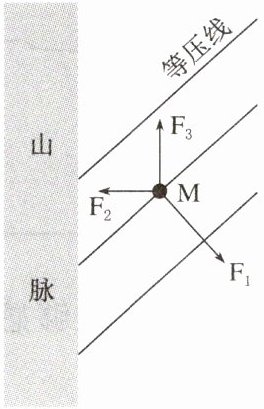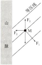 (1)下图示意M点所在水平面上的等压线分布及空气质点的瞬时受力平衡情况。在图中用→画出M点风向,并指出山脉的阻挡对冷空气运动的影响。