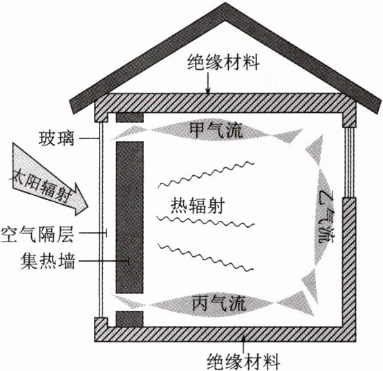 (2023·四川眉山调研)特朗勃墙是一种依靠墙体独特的构造设计,无机械动力、无传统能源消耗、仅依靠被动式收集太阳能为建筑供暖的集热墙体,其冬季白天工作原理如下图。据此完成4~5题。