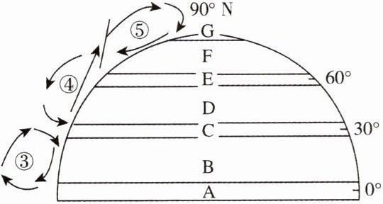 ①副极地低气压带 ②副热带高气压带 ③极地东风带 ④盛行西风带 ⑤东北信风带