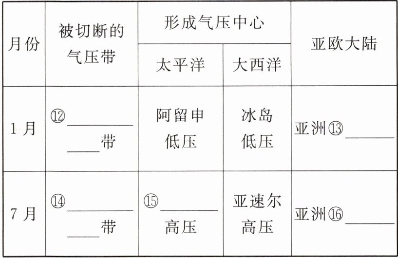 ①受热不均 ②地转偏向力 ③低纬环流 ④中纬环流 ⑤高纬环流 ⑥赤道低压带 ⑦副极地低压带 ⑧盛行西风带 ⑨北移 ⑩南移