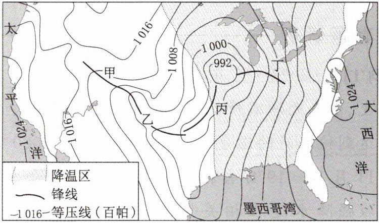 (2024·海南中学三模)2022年3月25—30日,北美部分地区受到冷空气影响,出现降温。下图为冷空气影响期间降温范围及31日地面天气形势图。据此完成1~3题。