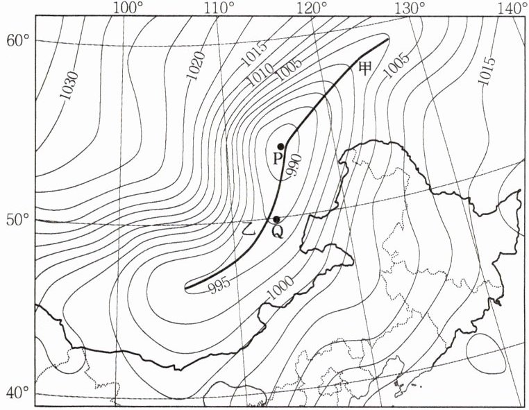 2023年3月29日至31日,亚洲部分地区发生大范围冷空气活动。下图为3月31日17时该地区海平面等压线分布,图中甲、乙两线示意锋的位置。