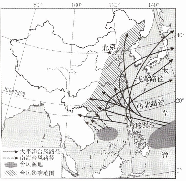 (1)当副热带高气压带势力较强,且呈稳定的东西走向时,台风受到向西的力,台风稳定西移,位于西移路径上;副热带高气压带势力较强,且呈西北—东南走向时,台风受到向西北的力,台风容易向西北移动,并在我国登陆,为西北路径;当副热带高气压带势力较弱时,台风受到向北的力,往往北上登陆或者转向,为转弯路径。