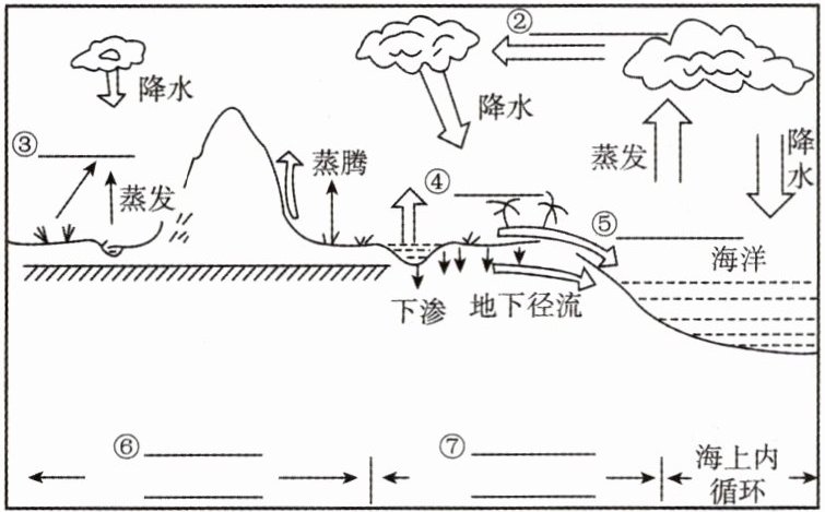 、岩石圈、生物圈中,通过蒸发(蒸腾)、水汽输送、降水、下渗、径流等环节连续运动的过程。(2) 在下图中标出水循环的主要环节和类型。