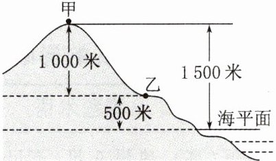 1. 海拔(绝对高度):某地高出①_______的垂直距离,如图中甲点海拔为②_______米,乙点海拔为③_______米。