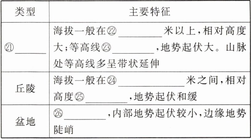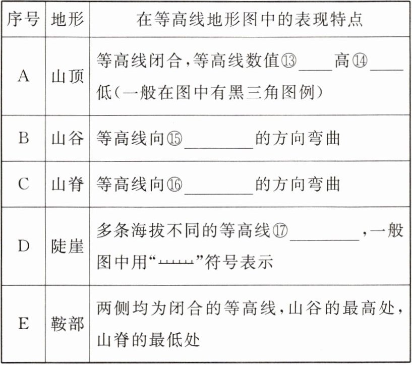⑤相等 ⑥相等 ⑦等高距 ⑧陡 ⑨缓 ⑩低值 ⑪高值 ⑫陡崖 ⑬内 ⑭外 ⑮数值增大 ⑯数值减小 ⑰重合 ⑱200 ⑲稀疏 ⑳密集 ㉑山地 ㉒500 ㉓密集 ㉔200~500 ㉕较小 ㉖周高中低 ㉗水文 ㉘气候 ㉙选线