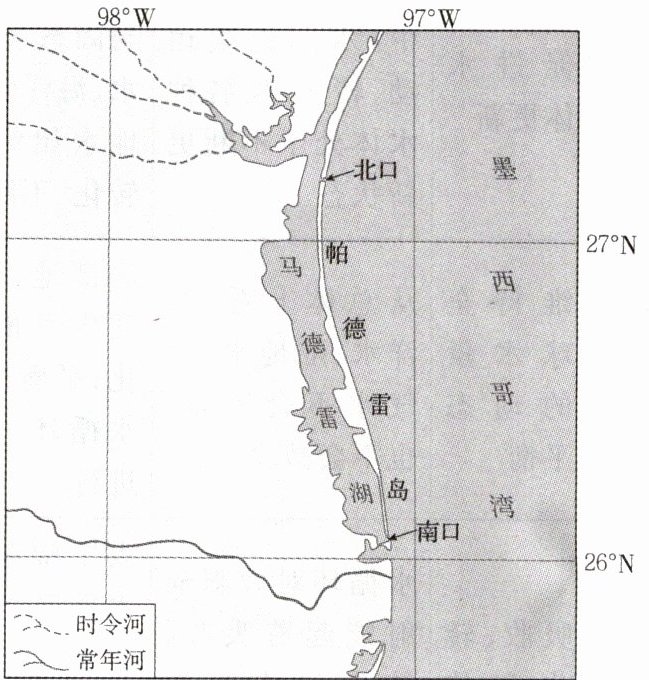 (2) 在帕德雷岛南北两侧的水体出入口处,表层水流动方向通常为(