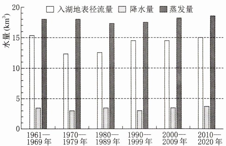 。下图示意该湖泊1961—2020年各时期入湖地表径流量、降水量、蒸发量的变化。据此完成(1)~(3)题。(1) 引起该湖泊近60年水量变化的主导因素是(