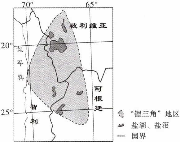 (1)根据材料可知,“锂三角”地区在地质时期原为海洋,后来由于安第斯山脉的隆起,使该地区与海洋分离,未退却的海水在低洼处聚集,形成内陆盐湖;根据材料可知,该地周边山区富锂岩石分布广,山上的富锂岩石在风化、侵蚀和重力崩塌作用下,部分含锂岩石从山上崩塌,后被流水搬运至湖泊中沉积;根据所学知识可知,该地纬度低,气候干旱,降水少,蒸发旺盛,使得锂盐不断在湖区富集。