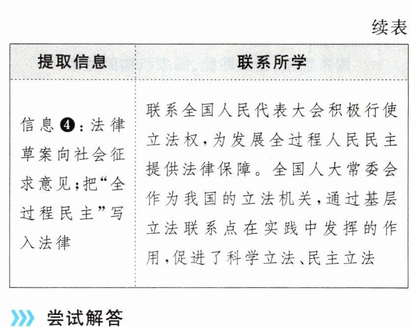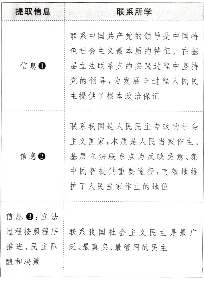 热点议题参考答案 ①中国共产党的领导是中国特色社会主义最本质的特征。在基层立法联系点的实践过程中坚持党的领导,为发展全过程人民民主提供了根本政治保证。②我国是人民民主专政的社会主义国家,本质是人民当家作主。基层立法联系点为反映民意、集中民智提供重要途径,有效地维护了人民当家作主的地位。③我国社会主义民主是最广泛、最真实、最管用的民主,立法过程按照程序推进、民主酝酿和决策,体现了全过程人民民主有完整的参与实践。④十三届全国人大四次会议上把“全过程民主”写入法律,表明了全国人民代表大会积极行使立法权,为发展全过程人民民主提供法律保障。⑤全国人大常委会作为我国的立法机关,通过基层立法联系点在实践中发挥的作用,促进了科学立法、民主立法。