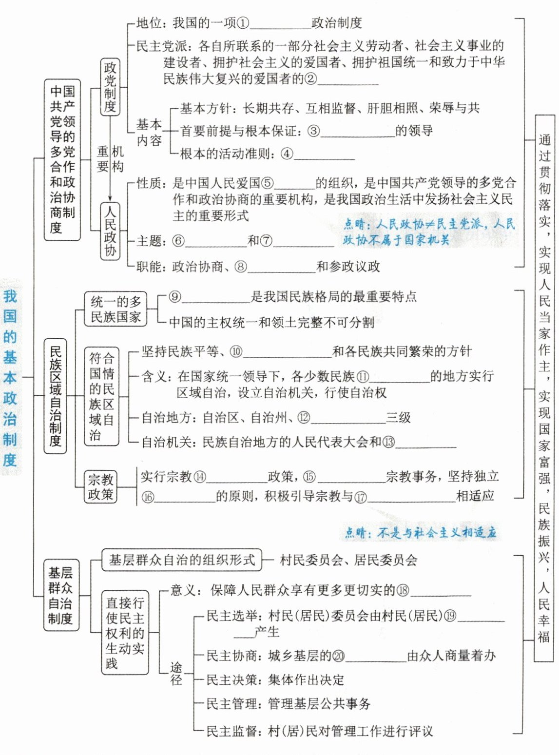 ①基本 ②政治联盟 ③中国共产党 ④宪法 ⑤统一战线 ⑥团结 ⑦民主 ⑧民主监督 ⑨多元一体 ⑩民族团结 ⑪聚居 ⑫自治县 ⑬人民政府 ⑭信仰自由 ⑮依法管理 ⑯自主自办 ⑰社会主义社会 ⑱民主权利 ⑲直接选举 ⑳公共事务