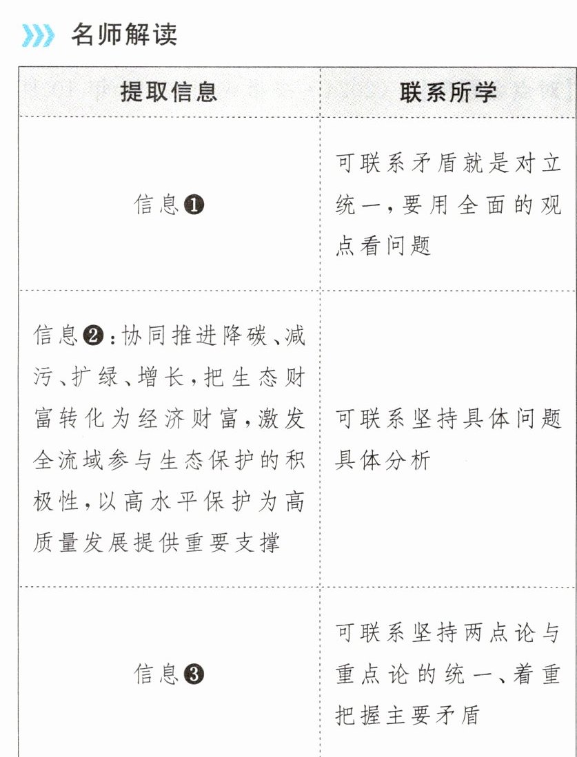 热点议题 参考答案 ①矛盾就是对立统一,要用全面的观点看问题。推动长江经济带高质量发展,根本上依赖于长江流域高质量的生态环境,长江经济带建设必须统筹兼顾长江流域的生态保护和开发利用两个方面,才能谋长远之势。②具体问题具体分析是正确解决矛盾的关键。长江经济带建设针对发展中的环境要求,在保持共抓大保护的战略定力,协同推进降碳、减污、扩绿、增长,把生态财富转化为经济财富,激发全流域参与生态保护的积极性,以高水平保护为高质量发展提供重要支撑,是长江流域发展的长久之策。③坚持两点论和重点论的统一,要着重把握主要矛盾。长江经济带事关全国发展大局,长江经济带建设要统筹好发展和安全在维护国家粮食安全、能源安全、重要产业链供应链安全、水安全等方面发挥更大作用,以一域之稳为全局之安作出贡献。