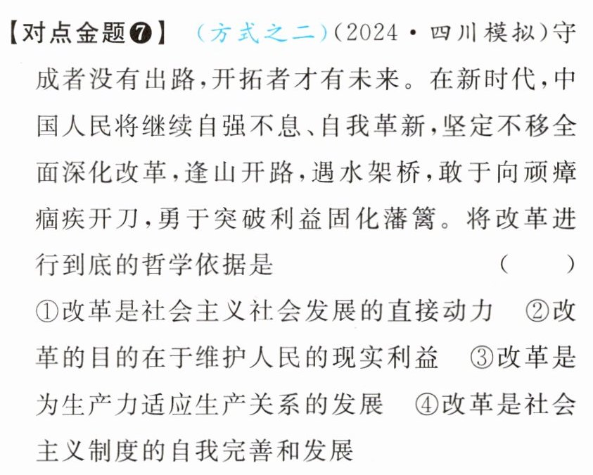 对点金题7 B 解析 重视改革是因为改革是社会主义制度的自我完善和发展,改革是社会主义社会发展的直接动力,①④说法正确。改革的目的是为了使上层建筑适应经济基础,使生产关系适应生产力,②③说法错误。故选B。
