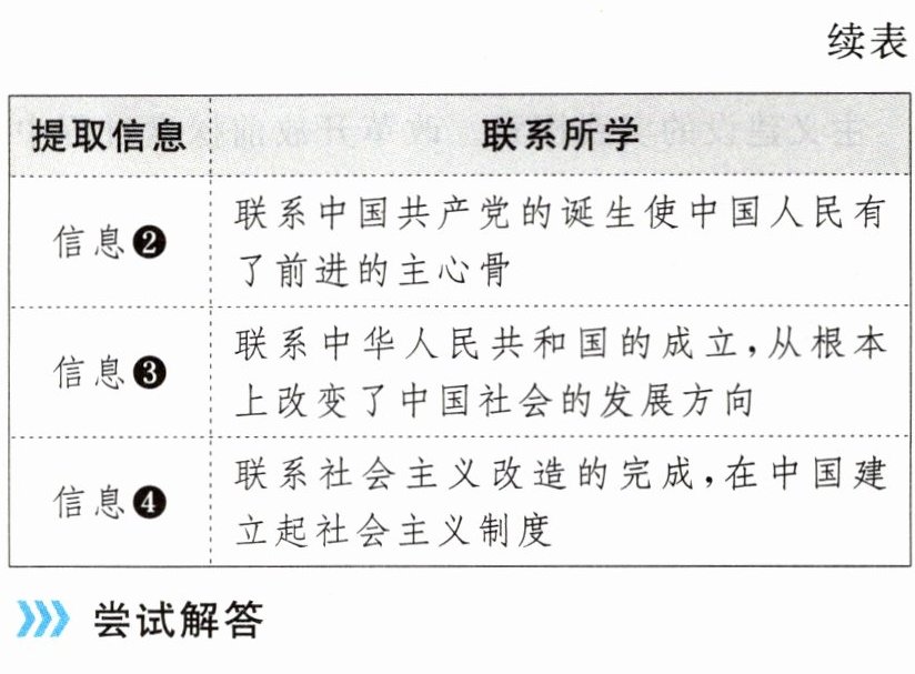 热点议题 参考答案 ①在半殖民地半封建社会的近代中国,资本主义道路走不通。②中国共产党的诞生使中国人民有了前进的主心骨。党领导各族人民夺取了新民主主义革命的伟大胜利。③中华人民共和国的成立,从根本上改变了中国社会的发展方向,为实现国家富强、民族复兴展示了美好前景和现实道路。④社会主义改造的完成,在中国建立起社会主义制度,实现了中华民族有史以来最为广泛而深刻的社会变革。