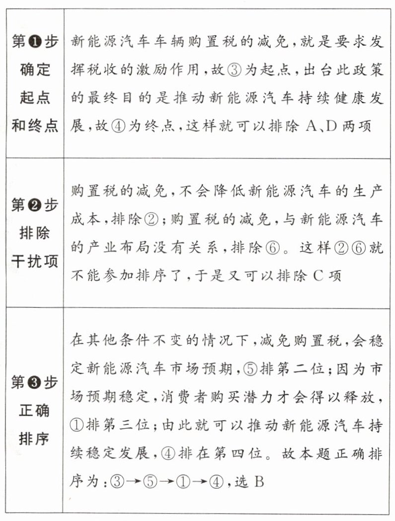 【典型题例②】(排序类)(2024·安徽模拟)财政部、国家税务总局、工业和信息化部日前联合发布公告,称对购置日期在2024年1月1日至2025年12月31日期间的新能源汽车免征车辆购置税,其中,每辆新能源乘用车免税额不超过3万元;对购置日期在2026年1月1日至2027年12月31日期间的新能源汽车减半征收车辆购置税,其中,每辆新能源乘用车减税额不超过1.5万元。关于这一举措带来的影响推导正确的是( )