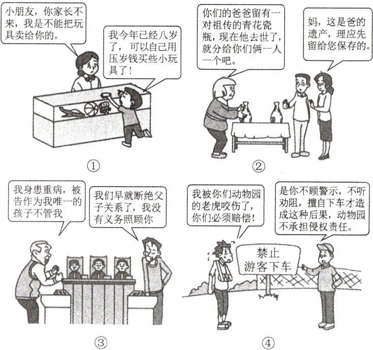 (漫画内容:①小朋友,你家长不来,我是不能把玩具卖给你的。②你们的爸爸留有对祖传青花瓷瓶的分配遗嘱,现在他去世了,就分给你们俩一人一个吧。③我身患重病,被宣告为无民事行为能力的孩子不管我。④我们早就断绝父子关系了,我没有义务照顾你!⑤是你不顾警示,不听劝阻,擅自下车才造成这种后果,动物园不承担侵权责任。)