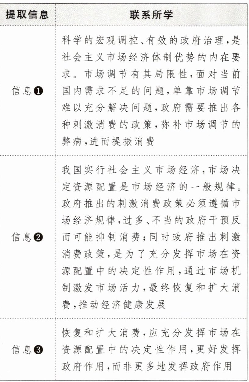 参考答案 ①该观点是片面的。②科学的宏观调控、有效的政府治理,是社会主义市场经济体制优势的内在要求。市场调节有其局限性,面对当前国内需求不足的问题,单靠市场调节难以充分解决问题,政府需要推出各种刺激消费的政策,弥补市场调节的弊病,进而提振消费。该观点看到了政府在恢复和扩大消费中的作用,有其合理一面。③我国实行社会主义市场经济,市场决定资源配置是市场经济的一般规律。政府推出的刺激消费政策必须遵循市场经济规律,过多、不当的政府干预反而可能抑制消费;同时政府推出刺激消费政策,是为了充分发挥市场在资源配置中的决定性作用,通过市场机制激发市场活力,最终恢复和扩大消费,推动经济健康发展。该观点认为“要更多地发挥政府作用”是片面的。④恢复和扩大消费,应充分发挥市场在资源配置中的决定性作用,更好发挥政府作用,而非更多地发挥政府作用。