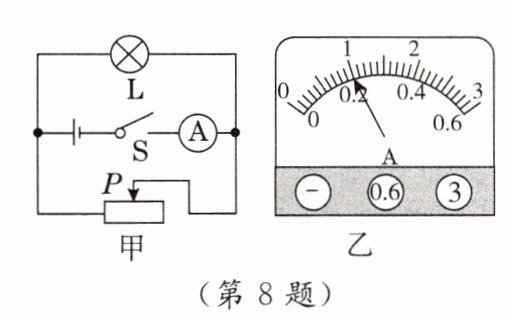 8. [2023.阜新,多选]如图甲所示,电源电压恒为6V。灯泡L的规格为“6V 3.6W”,且电阻不随温度变化。闭合开关S后,灯泡L正常发光,当移动滑动变阻器的滑片P时,电流表的示数发生变化,其最小值如图乙所示,最大值为满刻度。下列说法正确的是 ( )
