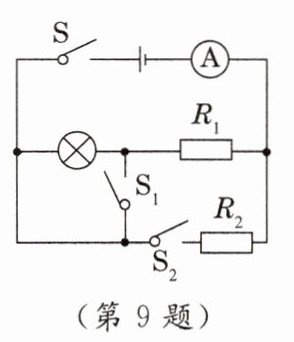 9. [2023.徐州改编]在如图所示电路中,灯泡标有“6V 3W”字样,R2的阻值为10Ω。只闭合开关S时,灯泡正常发光;开关S、S1、S2都闭合时,电流表的示数为2.4A。则灯泡的额定电流为__________A,R1的阻值为__________Ω。