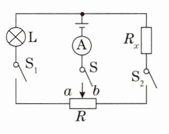 (3)由题图可知,闭合开关S₁、S₂,断开S₃,滑动变阻器与R₀串联,电流表测电路中的电流,将滑片调到滑动变阻器的a端,滑动变阻器接入电路的电阻最大,为20Ω,由串联电路的电阻特点和欧姆定律可知,电源电压U = I₁(R + R₀) = 0.20A×(20Ω + R₀)①;将滑片调到滑动变阻器的b端,滑动变阻器接入电路的电阻为零,由欧姆定律可知,电源电压U = I₂R₀ = 0.45A×R₀②,联立①②,解得R₀ = 16Ω,U = 7.2V。闭合开关S₁、S₂,断开S₃,滑片位置同