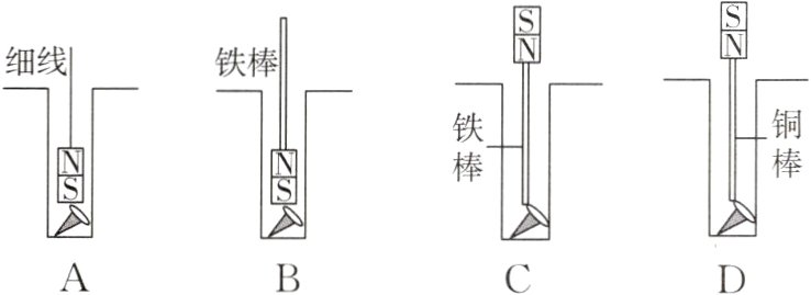 9.[2023.成都入学考试]在课外实验活动中,一颗铁质小螺钉掉入细小狭长的洞中。下面小科设计的方案中不能取出小螺钉的是 ( )
