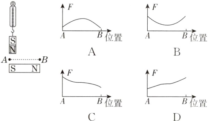 C [点拨]条形磁体两端磁性最强而中间磁性最弱,且同名磁极相互排斥,异名磁极相互吸引。当挂着的小磁体向右移动时,相互吸引力逐渐减小,过了大磁体中点后,相互排斥力逐渐增大,故可以得出弹簧测力计的示数F从A到B是逐渐变小的。