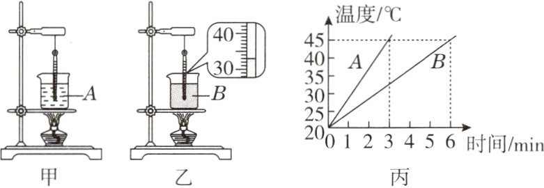 6. [2023.鞍山]小明为比较不同物质吸热的情况设计了如下的实验方案:将A、B两种液体分别装入烧杯中,固定在铁架台上,用两个相同的酒精灯同时加热,实验装置如图甲、乙所示,实验时每隔一段时间同时测量并记录A、B的温度。