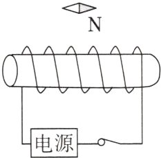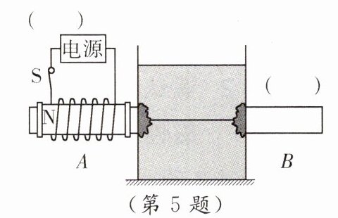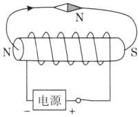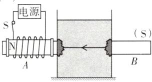 [点拨]已知A的左端为N极,根据安培定则,电流应该从通电螺线管的左端流入,从右端流出,正面电流方向向上,故电源的左端是正极。A和B两个磁体相互吸引,所以B的左端是N极,右端是S极,图中的磁感线的方向从右往左。