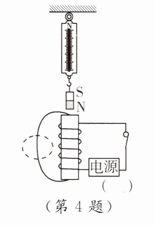 4.[2023.德州]如图所示,闭合开关后弹簧测力计示数减小。请标出电源右端的极性,并在虚线框内画出磁感线的方向。