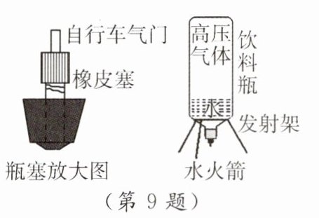 9.(课标素材题)[2023.黄石模拟]为培养学生动手能力,提高物理学科素养,九年级物理社团李老师在社团课中带领学生们制作了水火箭,如图是某水火箭的简易原理图。使用打气筒向水火箭内不断打气,当内部气体压强增大到一定程度时,会使水从水火箭中向下喷出,从而使水火箭升空。结合材料,你认为以下说法错误的是 ( )