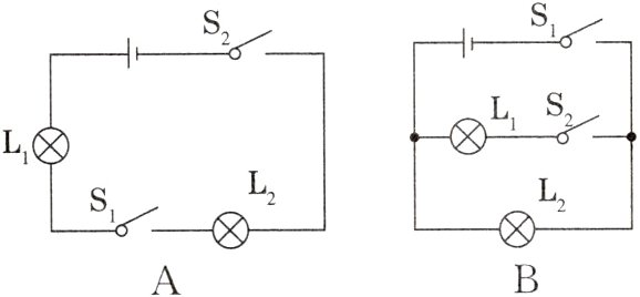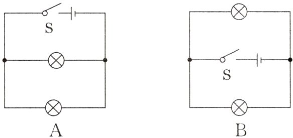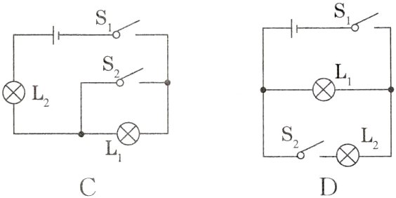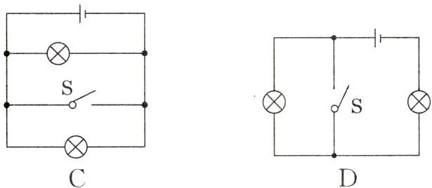 12. 在如图所示的四个电路图中,小灯泡的规格都相同。开关S闭合后,只有一个灯泡发光的电路是 ( )