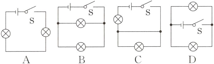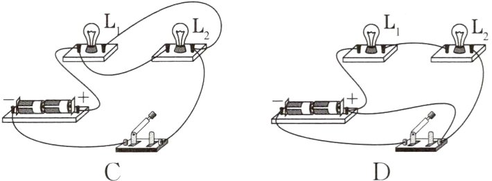 C [点拨]由题意知,两灯并联。题图A中,闭合开关时电流只有一条路径,两灯串联,故A不符合题意;题图B中,闭合开关时电流只有一条路径,是L₁的简单电路,L₂短路不亮,故B不符合题意;题图C中,闭合开关时,电流有两条路径,分别流经灯泡L₁和L₂,两灯并联,故C符合题意;题图D中,闭合开关时电流会不经用电器直接从电源正极流向负极,属电源短路,两灯都不亮,故D不符合题意。